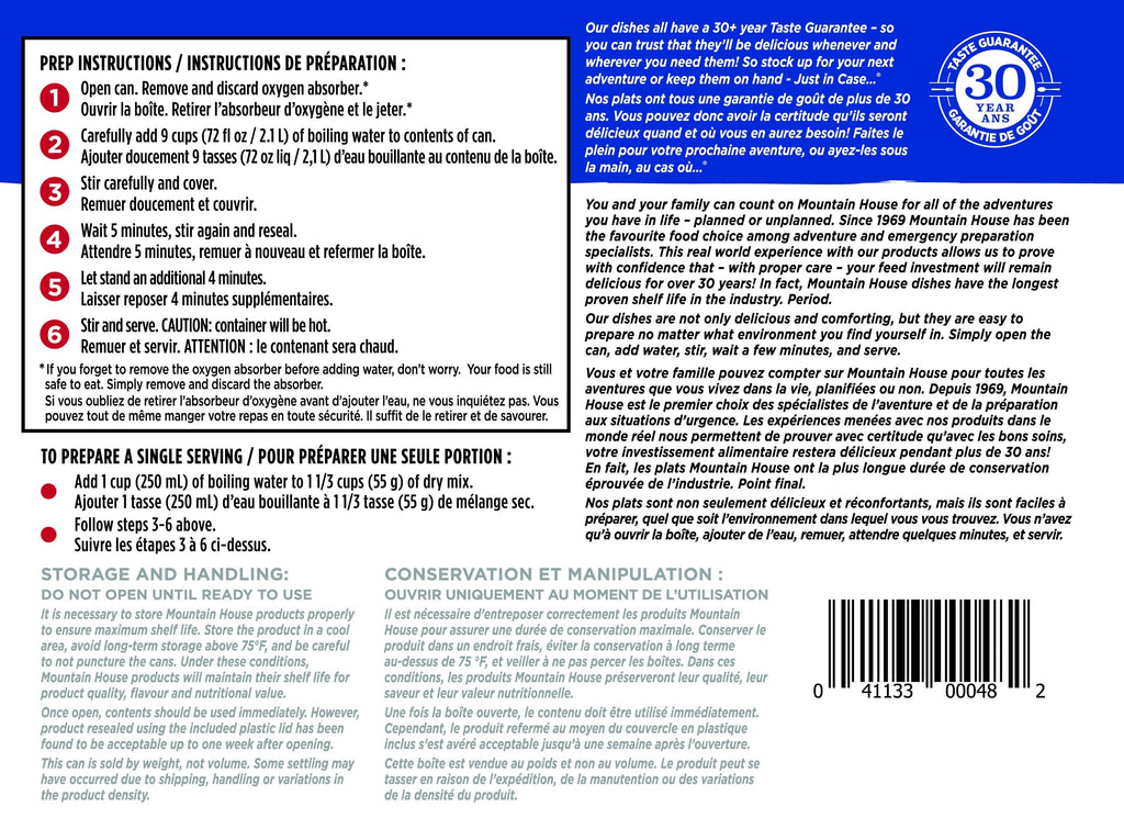 For nearly 50 years, consumers have continued to choose Mountain House as their favourite brand of freeze dried food for on-the-go adventures, emergency preparedness and survival. With just-add-water convenience, easy no-mess cleanup and home-cooked flavours, Mountain House is the best freeze dried camping, backpacking, hiking and emergency preparedness food money can buy!