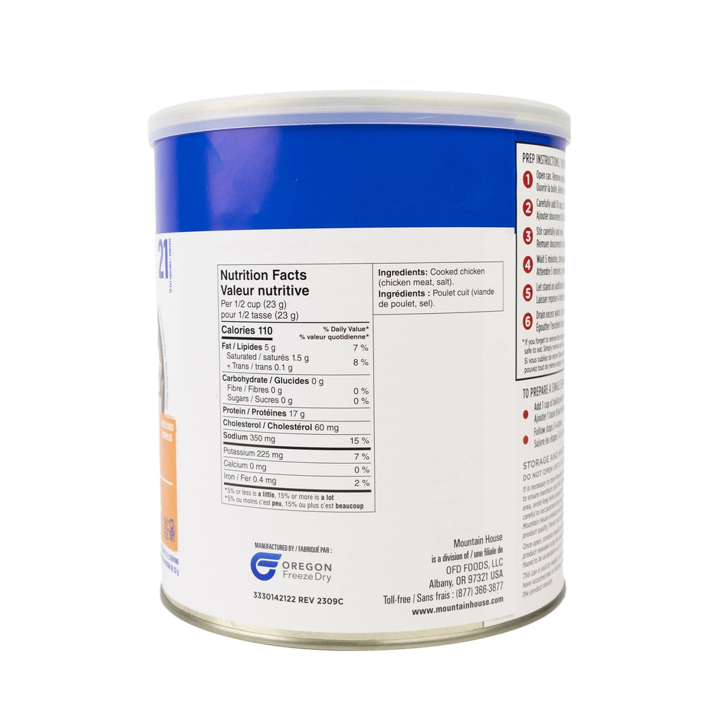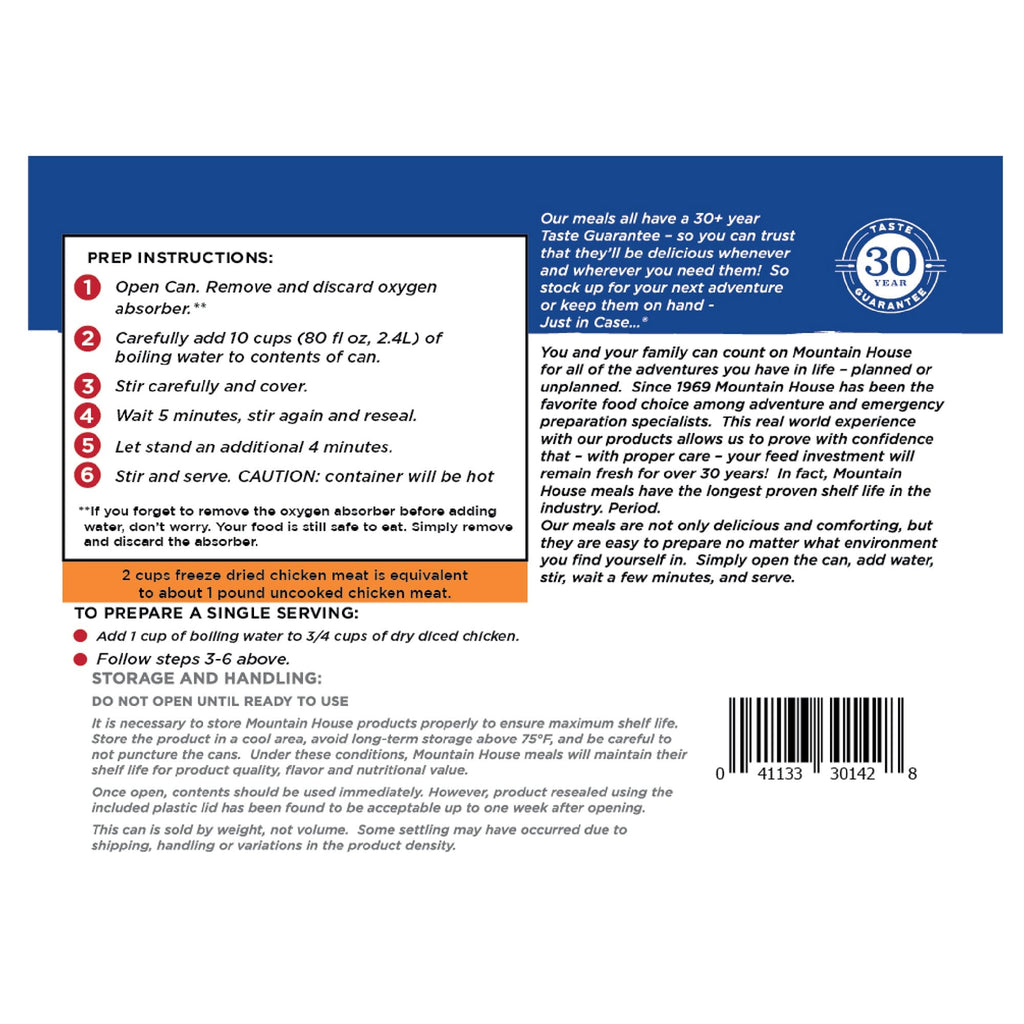 Elevate your cooking with Mountain House Diced Chicken, offering high-quality, cooked diced chicken that’s ready to incorporate into your favorite dishes. This gluten-free product is ideal for enhancing your emergency food storage or for preparing nutritious, protein-rich meals under any circumstances. Whether you’re making a quick stir-fry during a camping trip, supplementing a meal at home, or needing a reliable protein source in emergencies, our Diced Chicken is the perfect addition. Simply add it to your desired dish for a delicious, high-protein meal.