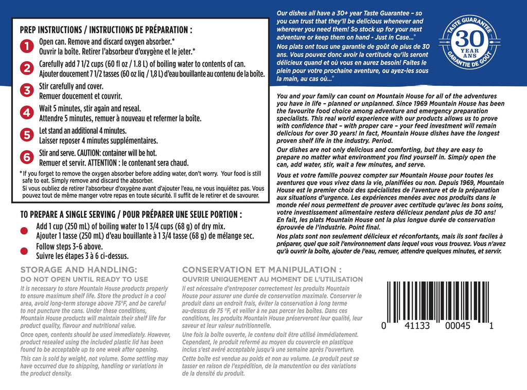 For nearly 50 years, consumers have continued to choose Mountain House as their favourite brand of freeze dried food for on-the-go adventures, emergency preparedness and survival. With just-add-water convenience, easy no-mess cleanup and home-cooked flavours, Mountain House is the best freeze dried camping, backpacking, hiking and emergency preparedness food money can buy!