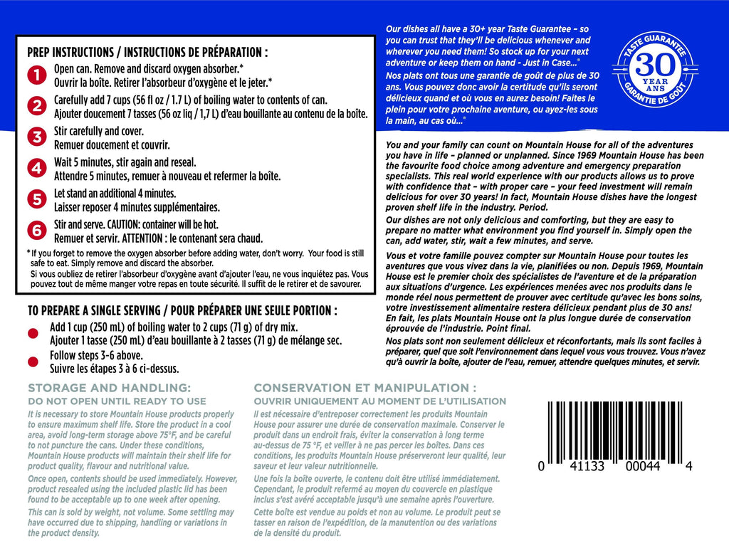 For nearly 50 years, consumers have continued to choose Mountain House as their favourite brand of freeze dried food for on-the-go adventures, emergency preparedness and survival. With just-add-water convenience, easy no-mess cleanup and home-cooked flavours, Mountain House is the best freeze dried camping, backpacking, hiking and emergency preparedness food money can buy!